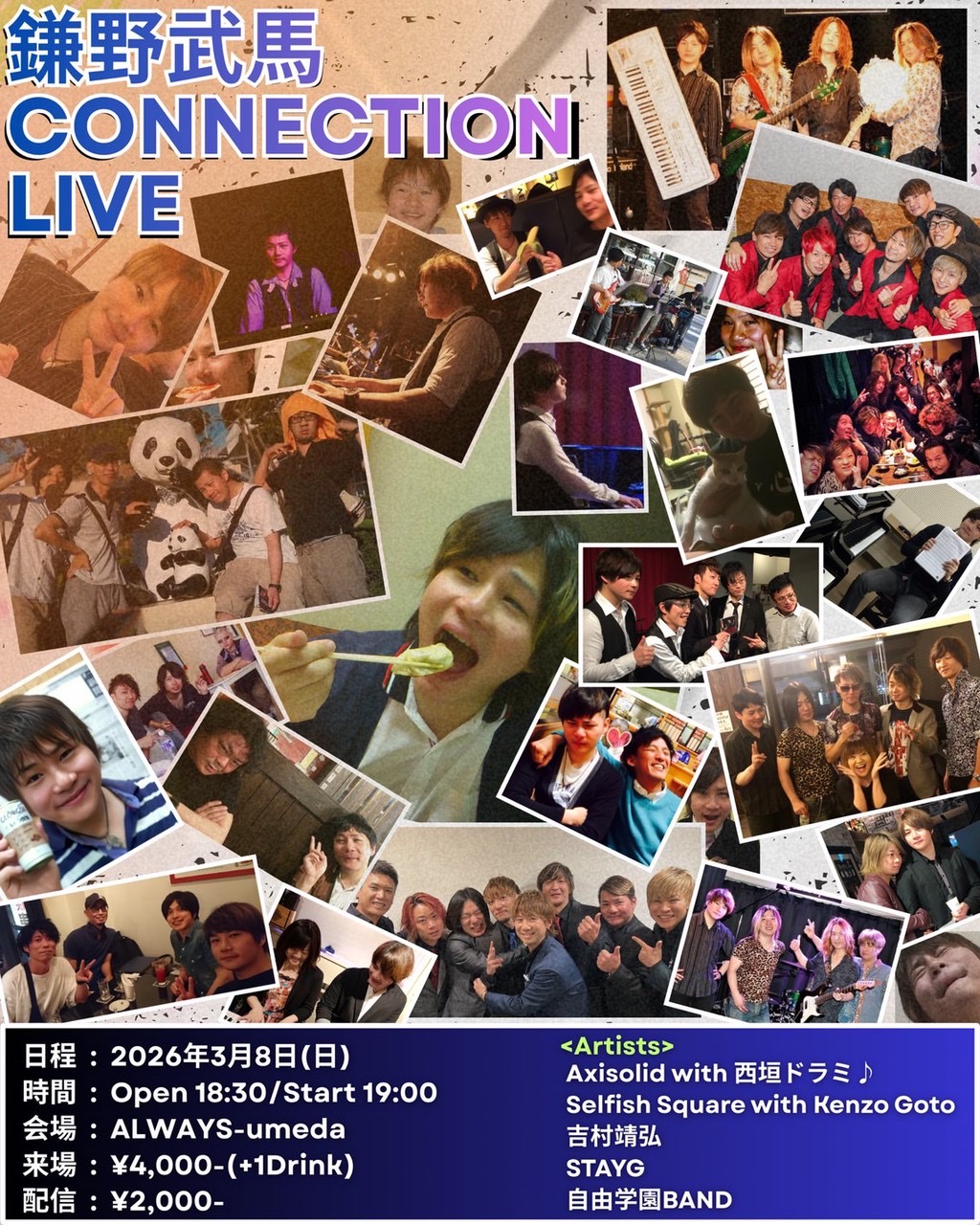 『鎌野武馬CONNECTION LIVE』 at.梅田Always 開場 18:30 開演 19:00 チケット:4,000円(+1ドリンク代) ※Si-to・榎田俊介の2人編成でのライブになります。