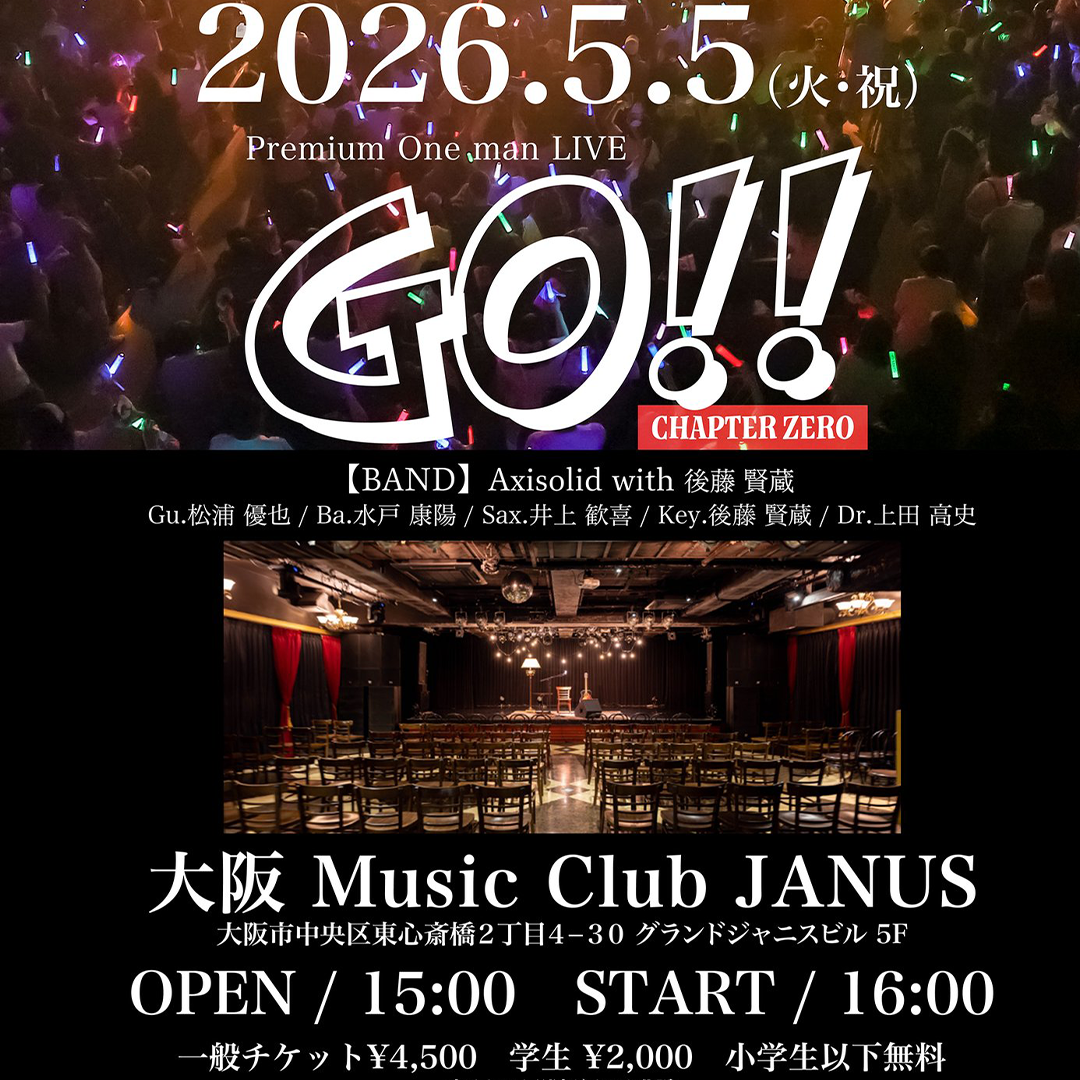 大阪・心斎橋music club JANUSにてバンドワンマン決定 STAYG Premium One man LIVE 『GO!!-CHAPTER ZERO-』 開場 15:00 開演 16:00 BAND : Axisolid with 後藤賢蔵 一般¥4,500 学生¥2,000 小学生以下無料