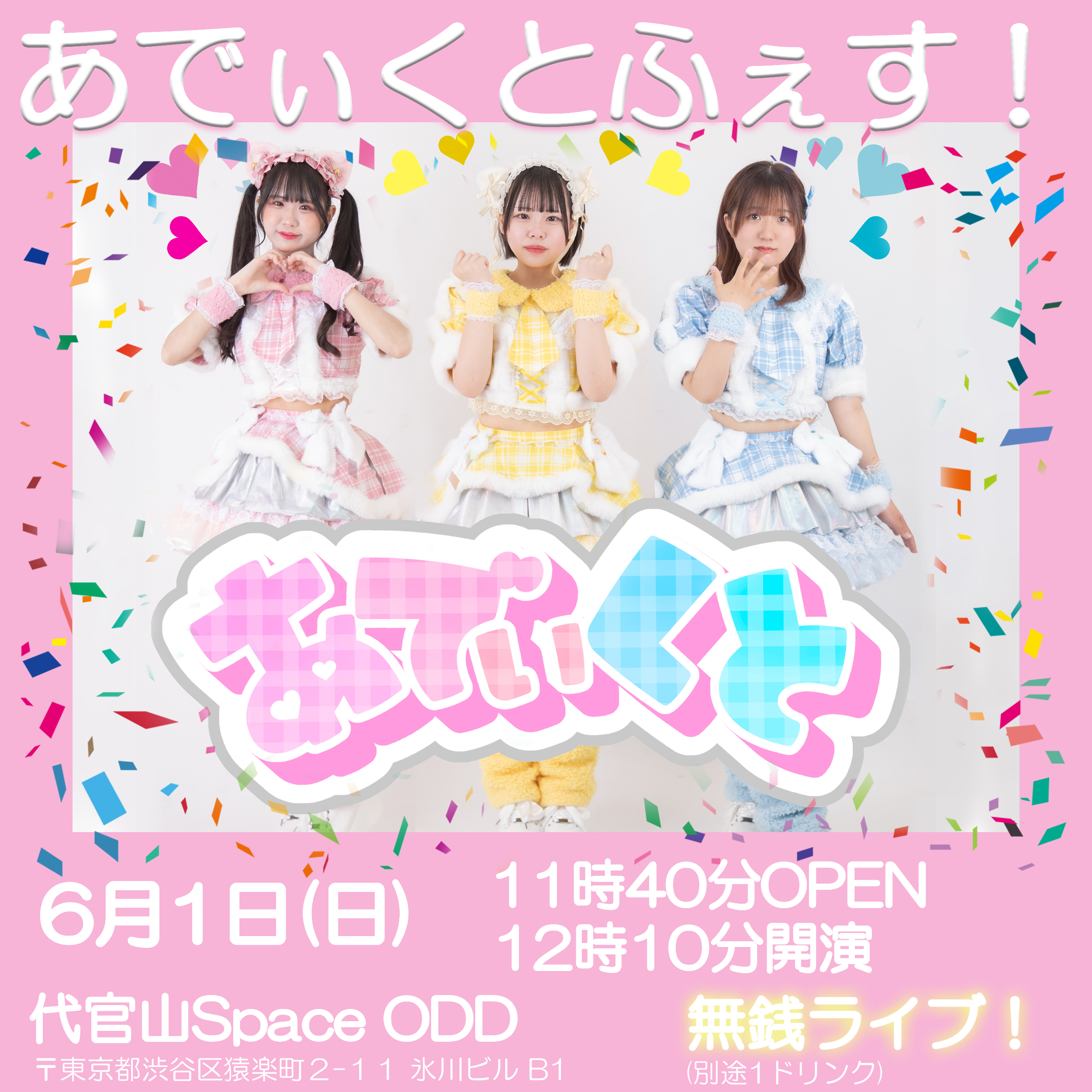 あでぃくとワンマンライブが代官山SpaceODDにて急遽開催! 新三人体制を祝して無銭ライブを開催致します。 開場:11時40分 開演:12時10分 物販:13時20分~14時30分